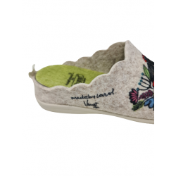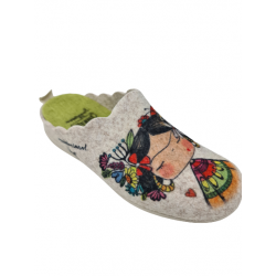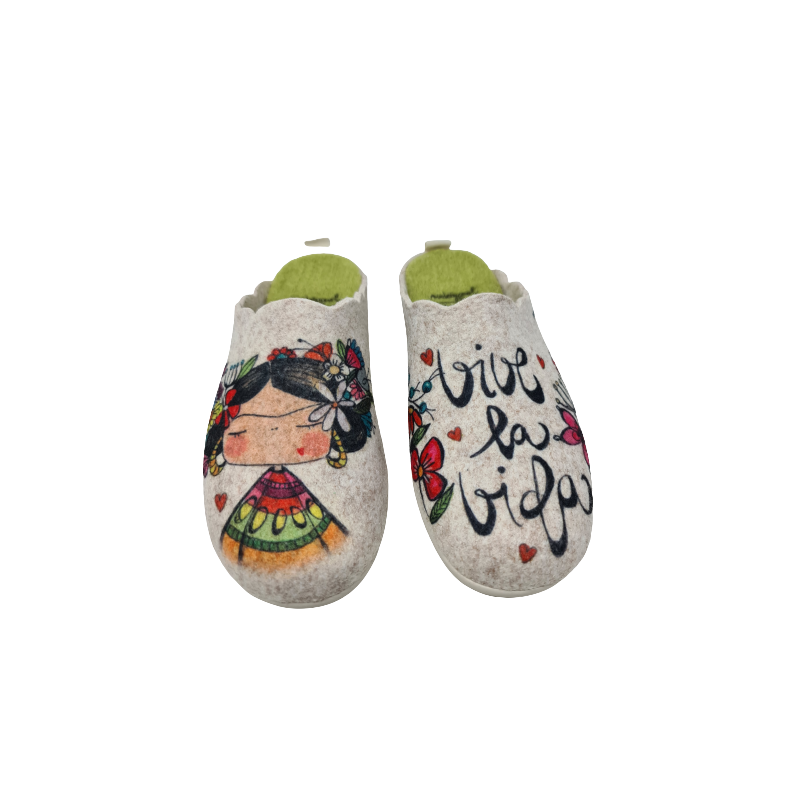 DIVERTIDAS ZAPATILLAS DE CASA FRIDA MARCA VIVANT PARA MUJER PLANTILLA EXTRAIBLEEN TONO PISTACHO PALA DE FIELTRO ESTAMPADA SUELA DE GOMA MODELO 212660 FABRICADAS EN ESPAÑA