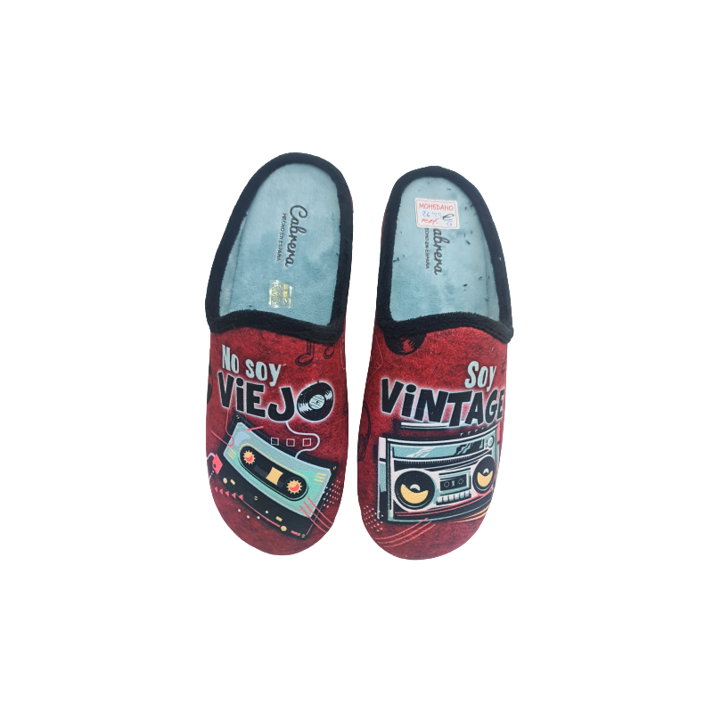 ZAPATILLA DESTALONADA, SOY VINTAGE, MATERIAL PAÑO, PLANTILLA EXTRAIBLE, PISO DE CAUCHO. NUMERACIÓN DEL 40 AL 46. HECHO EN ESPAÑA, MARCA CABRERA.