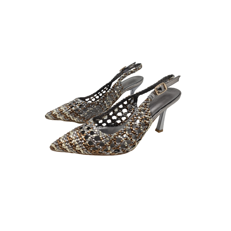 ZAPATO DESTALONADO DE REJILLA, COLORES METALIZADOS, PLANTILLA ACOLCHADA, TACÓN METALIZADO, PISO DE GOMA. ALTURA DEL TACÓN 9 CENTÍMETROS.