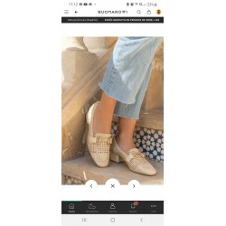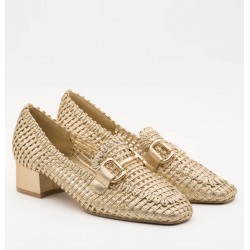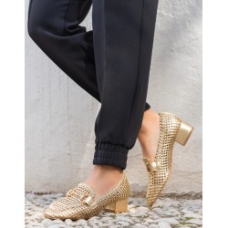 MOCASÍN DE REJILLA CON ADORNO DE ESTRIBO EN LA PALA, PLANTILLA ACOLCHADA, PISO DE GOMA, TACÓN FORRADO EN DORADO, MEDIDA DEL TACÓN 3,5 CENTÍMETROS.