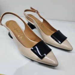 STILETTO DESTALONADO EN POLIPIEL CON ADORNO EN LA PALA, SUJECCIÓN CON HEBILLA, PLANTILLA DE PIEL, SUELA DE GOMA, ALTURA DEL TACÓN 4,5 CENTÍMETROS, HECHO EN ESPAÑA, MARCA DANIELA VEGA.